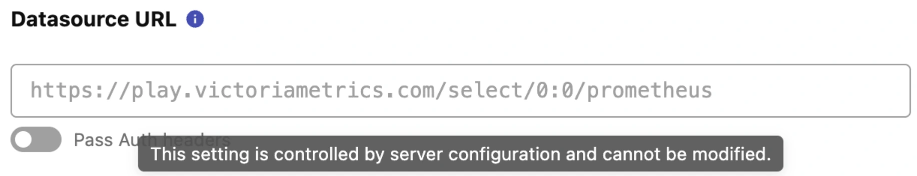 - Datasource URL (VictoriaMetrics, VictoriaLogs)