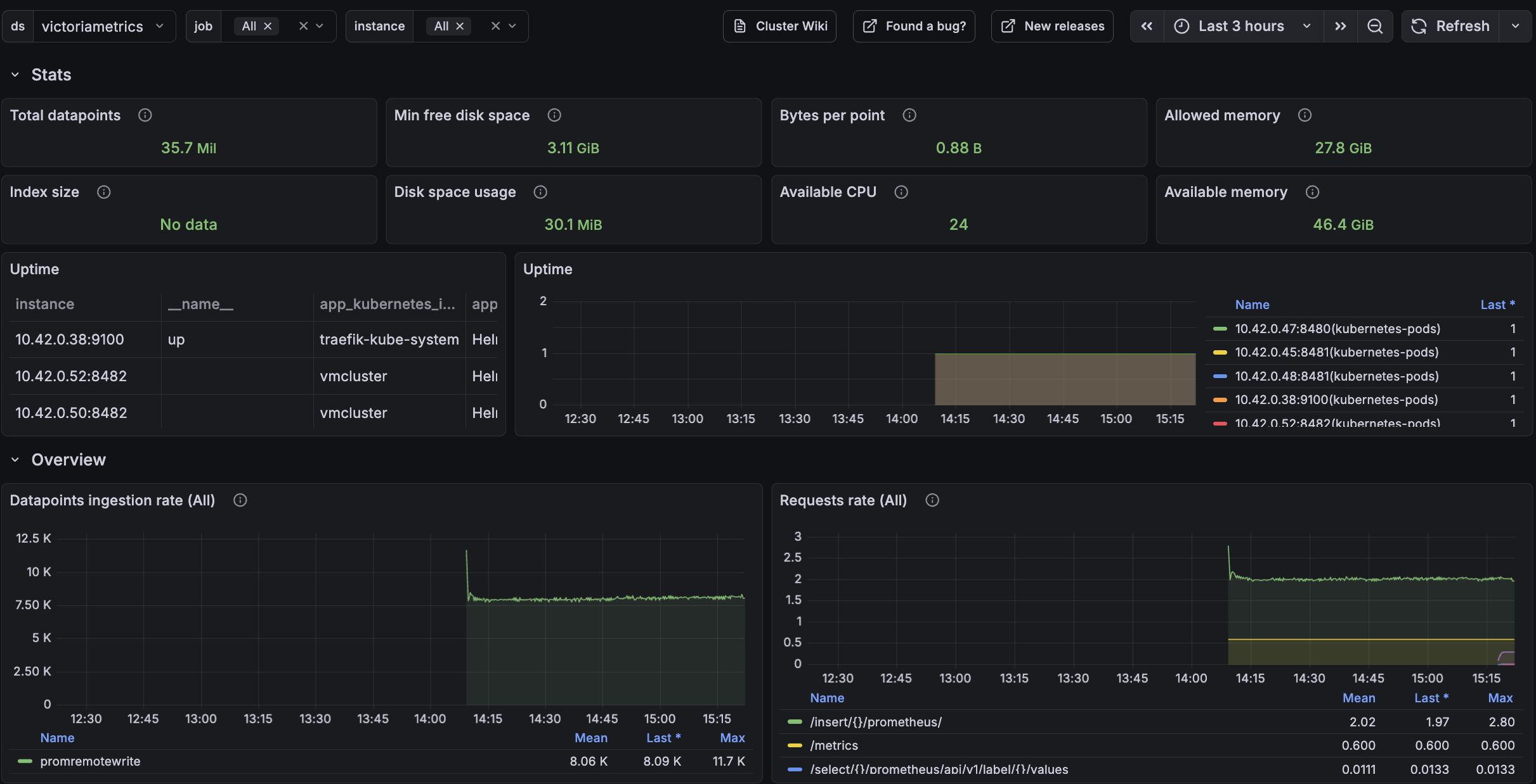 The VictoriaMetrics cluster dashboard is also available to monitor telemetry ingestion and resource utilization: