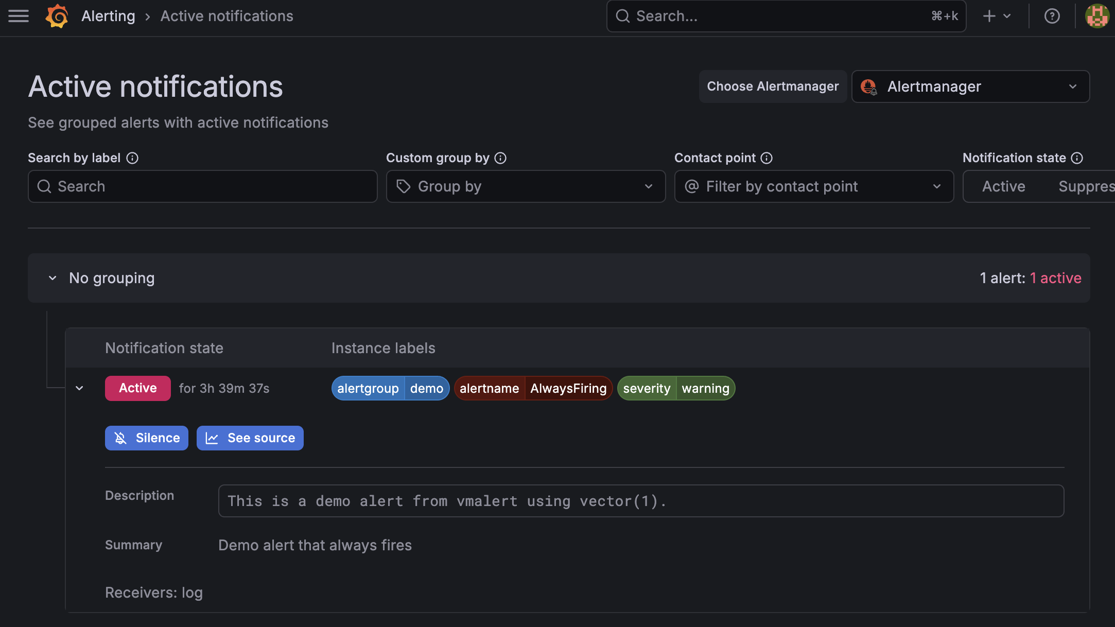 With vmselect’s vmalert.proxyURL set and Alertmanager configured as a datasource, Grafana should now be able to display vmalert rules and alert instances from the VictoriaMetrics Cluster datasource and show notifications managed by Alertmanager in its UI.