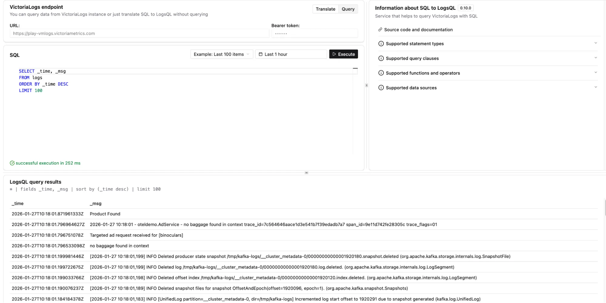 This playground enables you to query data from a VictoriaLogs instance or translate SQL to LogsQL without querying.