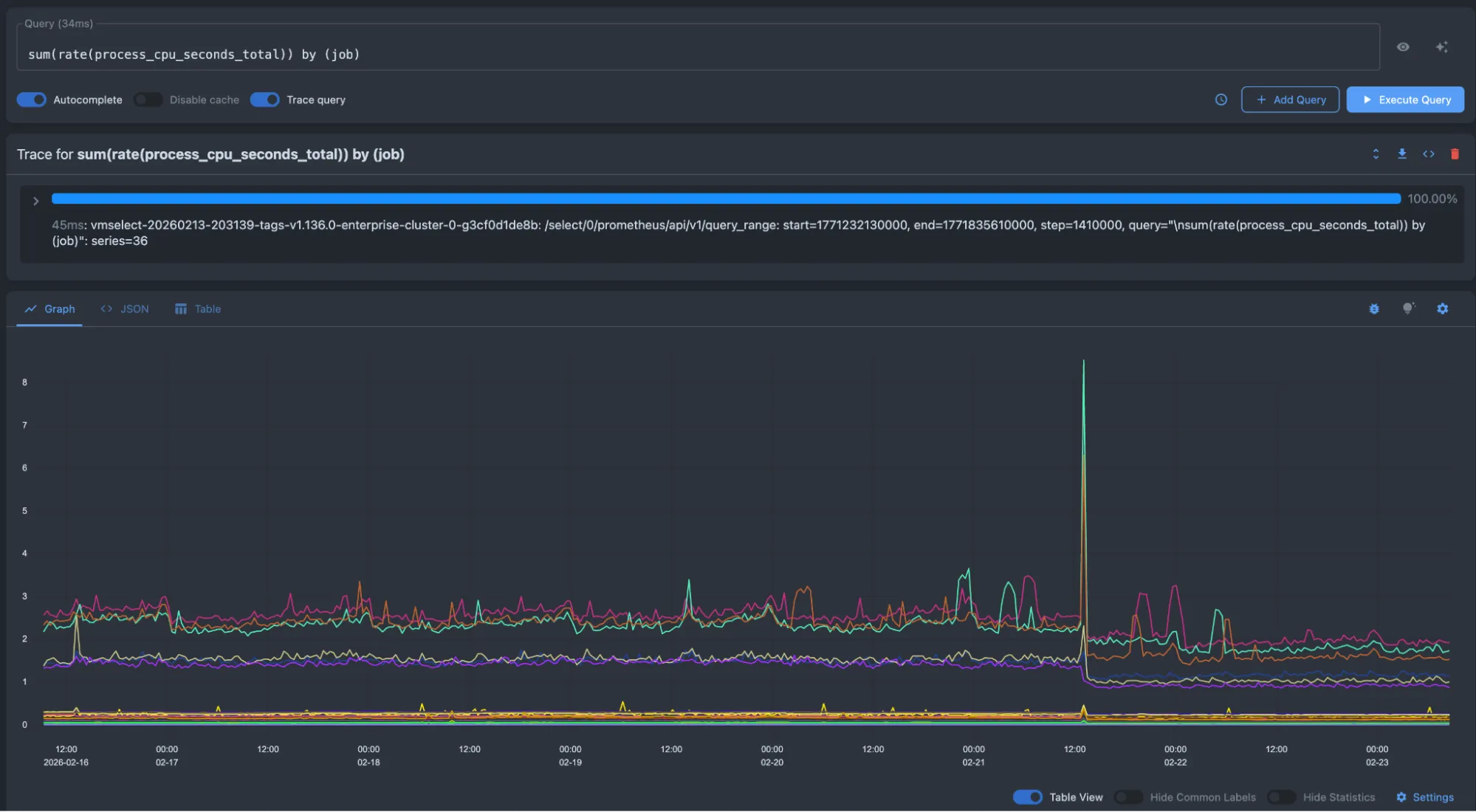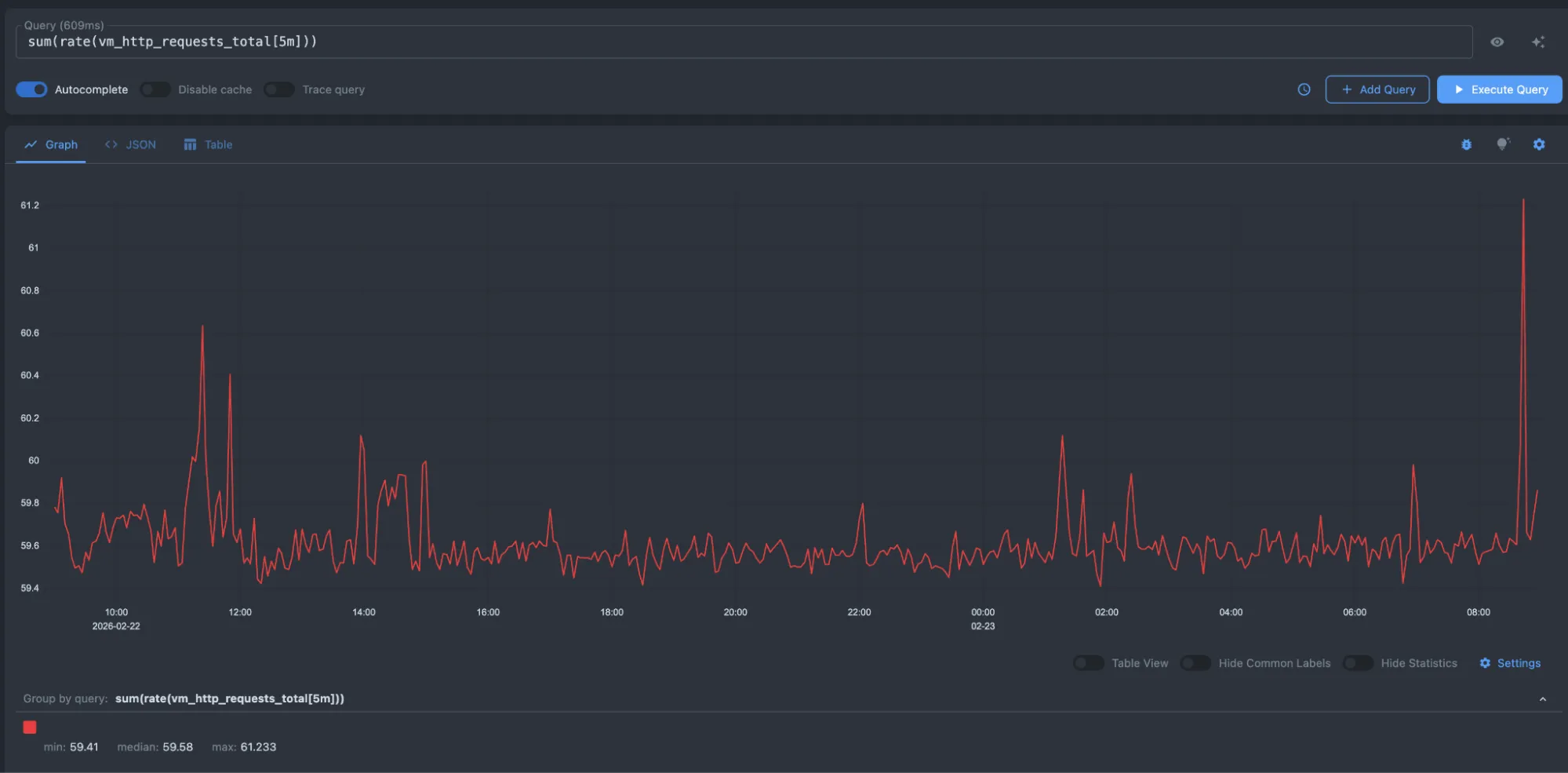 The query tab provides a sandbox to experiment with MetricsQL . Turn on Autocomplete and start typing to discover time series. You can add multiple queries and compare them.